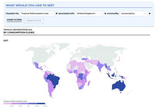 Whilst interesting to individual consumers, the key value of this work is the potential to use it at a national scale. The data allows users to identify commodities and producer countries where the greatest impacts related to the UK’s (or another country’s) consumption are being felt. This information can be used to inform policies and delivery mechanisms in a range of areas and will help us identify where to focus action for supply and demand side measures. Being able to unpick the information available through the dashboard is an exciting step towards improving the sustainability of a country’s national consumption.