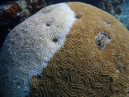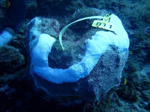 Photo: A disease coral colony with the chlorine and cocoa butter based treatment applied (© Emmy Aston / Scuba Montserrat).