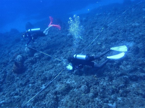 Photo: Montserrat divers conducting coral colony mapping on Montserrat’s coral reefs (© Dr Greta Aeby).