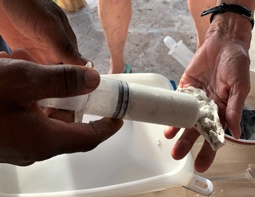 Photo: Workshop participants practicing applying the chlorine-based coral disease treatment (© Abbie Dosell / JNCC).
