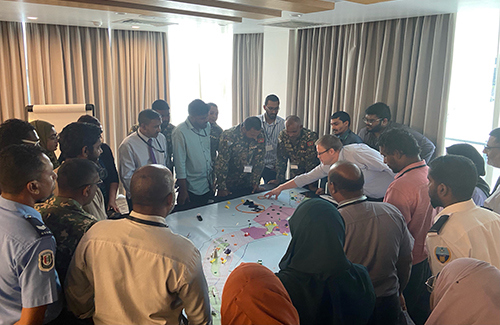 Images 6 and 7: Marine pollution emergency response workshop: a presentation given by the Maldives coastguard; participants at a table-top exercise (photographs © OCPP).