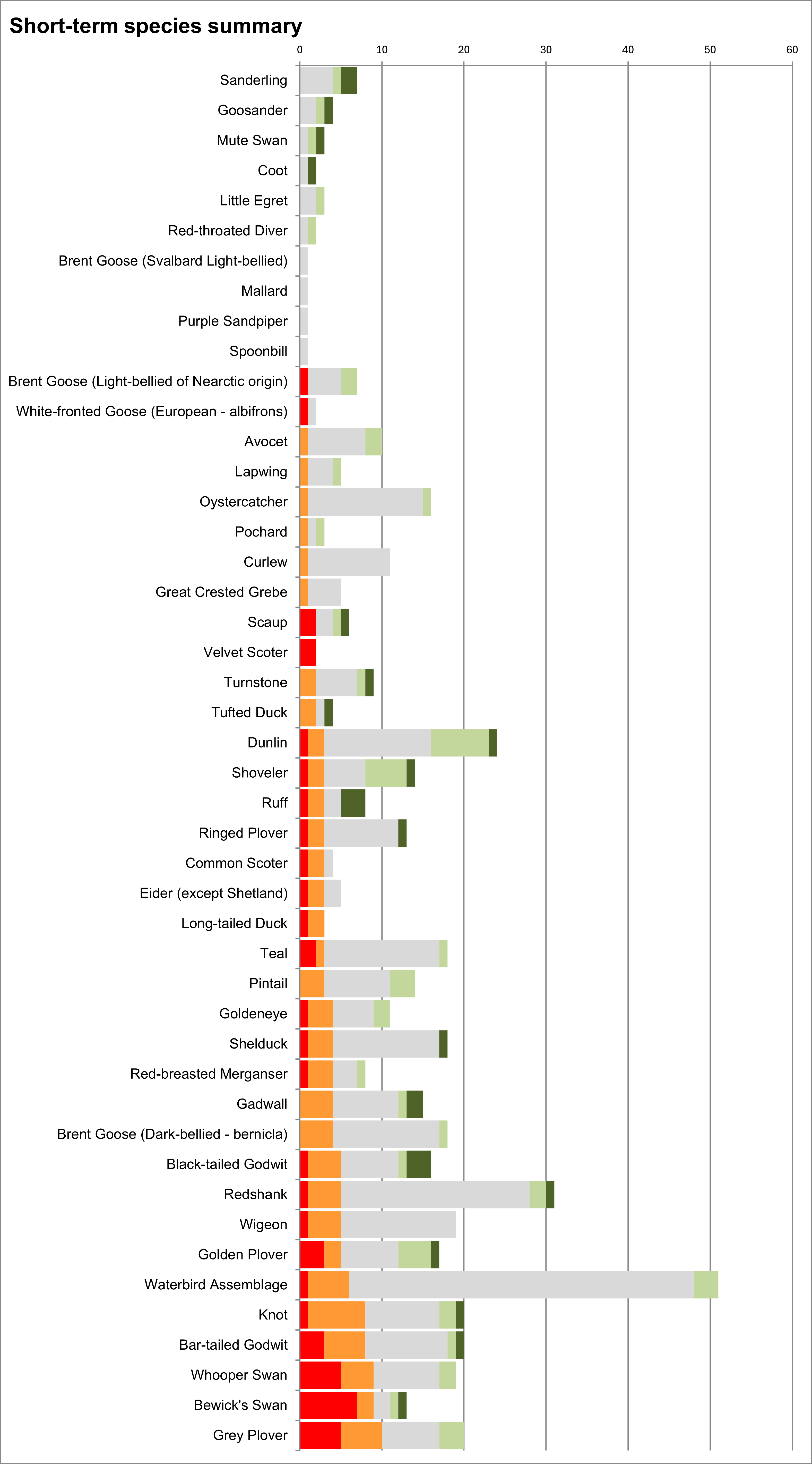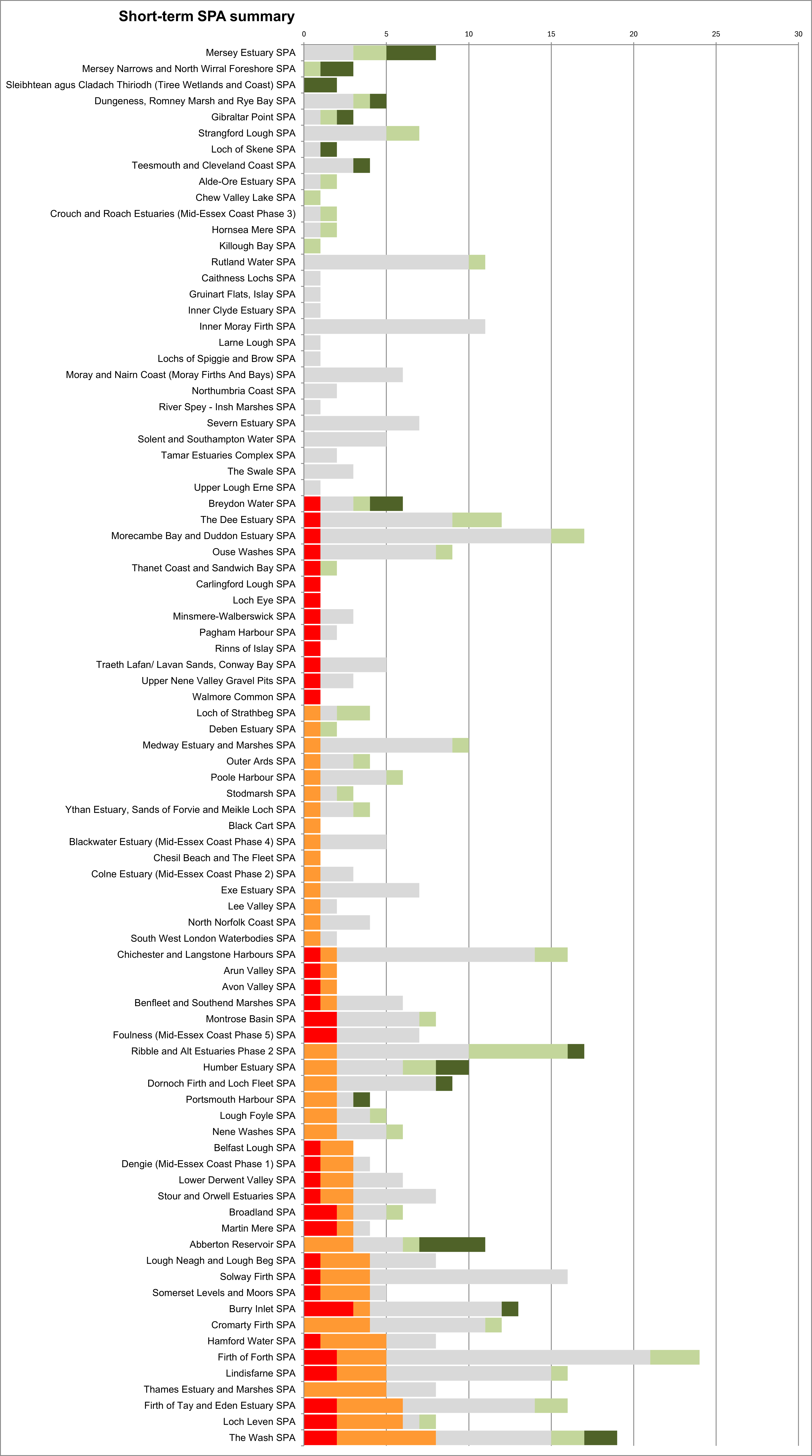 The Alerts are displayed in Figure 1 as stacked histograms which show the Alert status for each of the 87 SPAs assessed during short-, medium- and long-term and since the SPA baseline period. Each bar represents an SPA identified by name and they are sized according to the number of designating waterbird species assessed, which ranges from one to 24. The bars are ordered by the number of Alerts triggered for that SPA, and show the Alerts status for each of the qualifying species in that SPA to help put the Alerts into context.
