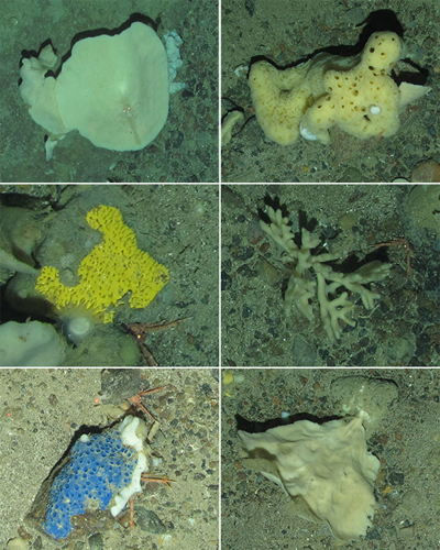 Photos (from top left to bottom right): 1 – This funnel shaped sponge makes a nice shelter for a shrimp; 2 – A large, yellow, porous sponge; 3 – A bright yellow sponge grows in a thin layer over a rock; 4 – A branching sponge; 5 – A vivid blue sponge growing over a rock, which is also home to a pair of squat lobsters; 6 – This large fan-shaped sponge reaches up into the currents flowing across the seabed. (Photos © JNCC/MSS 2021)