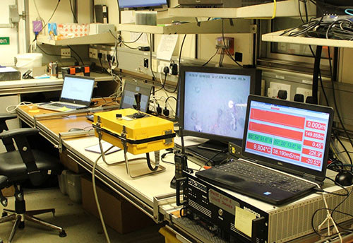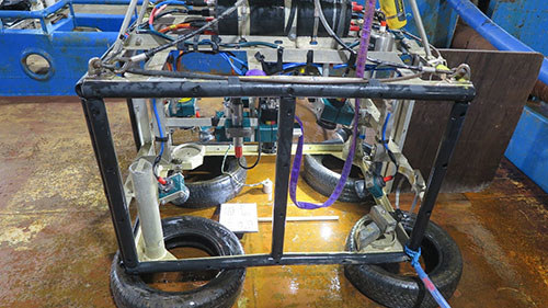 The multiplexer system has two halves, a "Subsea pod" that is attached to the camera frame (Photo 1) and a "Topside unit" that stays dry on the vessel (Photo 2). The camera frame is a simple sturdy metal frame. It is fitted with lights, cameras and instruments which measure the environmental conditions and help the engineers "fly" the frame in the water. The Topside unit is connected to two video monitors to show the pictures from the cameras and a laptop that provides control signals and displays the instrument data. Power for the whole system comes from a standard wall socket you would find at home.