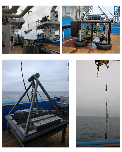 Photos of equipment used on the survey. From top left to bottom right: chariot, drop frame, Hamon grab, and CTD (© JNCC/MSS 2021).