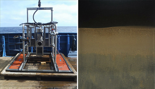 Photo 2: The Sediment Profile Imaging (SPI) system; and an example photograph from the SPI system, with light brown sand and mud at the surface and darker coloured anoxic sediment deeper down. © JNCC/Cefas.