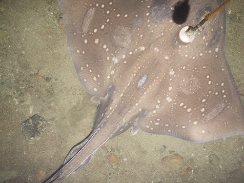 The second animal that we captured (see Image 2) looks to be a large flapper skate (Dipturus intermedius). It is sometimes difficult to tell the difference between a skate and a ray, especially when the head is not visible. There are other signs that can help in identifying the animal. Skates’ bodies have a round or triangular shape, while rays are often kite-shaped. Skates also have thicker fleshier tails with small fins and no spine, while rays have long, thin whip-like tails with stinging barbs. While skates don’t have stinging barbs for protection, they have patches of thorn-like formations on their backs at the end of each wing which are more prominent in mature male animals. Can you spot them on the picture?