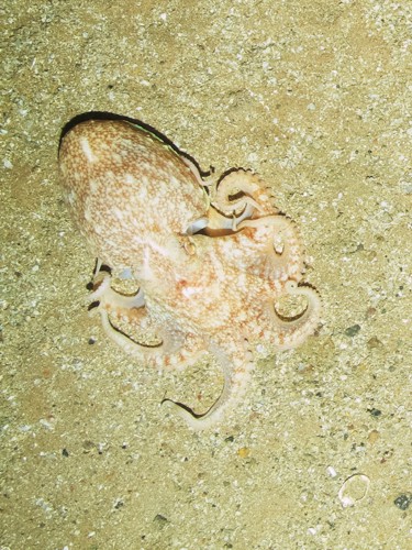 And finally, the mighty octopus (Image 3). This little fellow is likely to be Octopus vulgaris, widely known as common octopus. Octopuses are incredibly intelligent creatures and are considered the most intelligent invertebrate in the animal kingdom. Octopuses are skilful predators that have been observed to use tools or solve relatively complex tasks. They also have highly specialised cells called chromatophores that allow them to rapidly change colour and skin texture patterns, primarily for camouflage and communication. In the image, we can see that this octopus perfectly blends with the shelly sand in the background by mimicking its colour and texture.