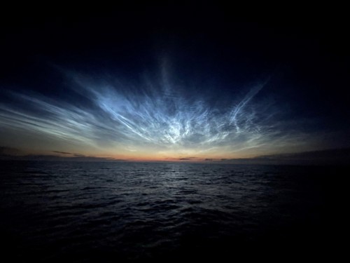 Apart from interesting marine life, we were also lucky to observe a rare atmospheric event – noctilucent clouds (Image 4). Noctilucent clouds, also known as night shining clouds, are cloud-like phenomena in the upper atmosphere of the Earth. They are only visible at twilight when the Sun is below the horizon while these very high clouds are still in sunlight. These incredible clouds are most often observed during the summer months from latitudes between 50 and 70 degrees and typically have a white colour. Noctilucent clouds are composed of tiny water ice crystals and exist in the mesosphere, which is the third and coldest layer of the atmosphere (50–100 km altitude).