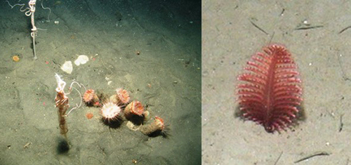 Figure 2: Still photographs from the Central Fladen MPA, showing: Left – tall sea-pens (Funiculina quadrangularis) with brittle stars attached to them, and anemones; Right – the phosphorescent sea-pen (Pennatula phosphorea) (© JNCC & Cefas).