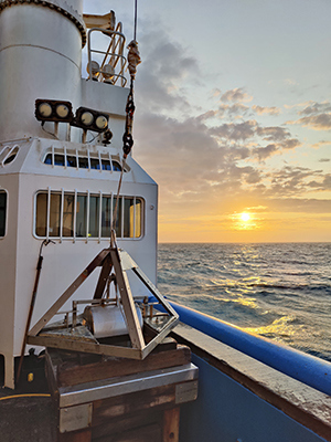 Figure 3: The Day grab we are using to collect sediment samples on this survey to Central Fladen, and a beautiful sunset over the sea.