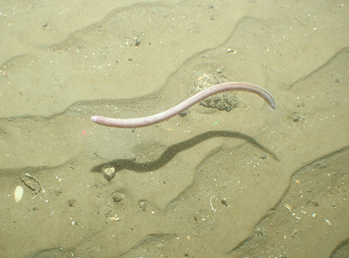 The diverse habitats and invertebrate communities of the site are also reflected in the number of fish species we’ve seen whilst recording images of the seabed. These have included starry rays (Image 6), haddock, monkfish, gurnards, and the rather unfortunately named hagfish (Image 7). Hagfish are blind but have a very good sense of smell and are experts at finding dead or dying fish to feed on. They are also notorious for producing copious amounts of slime – their Latin name (Myxine glutinosa) comes from the ancient Greek word myxa for slime and the Latin word glutinosa for viscous and sticky.