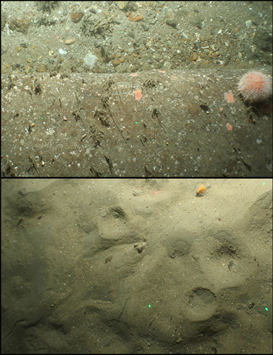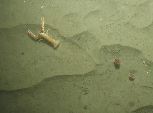 In contrast to the coarse, stony areas of the site there are large expanses of soft muddy and sandy sediments. These softer sediments provide the ideal habitat for species like the phosphorescent sea pen (Pennatula phosphorea) and Norway lobster (Nephrops norvegicus) (Image 5). Each sea pen consists of colonies of polyps that form branch-like leaves which filter the water for food. The lower half of the sea pen acts like an anchor in the soft sediment against the current. The phosphorescent sea pen gets its name from its ability to luminesce a blue/green colour when disturbed.