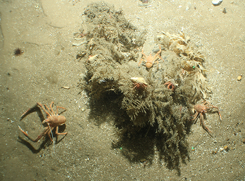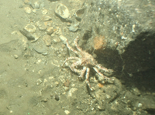 These stony areas are often home to some of the larger mobile crustaceans seen throughout the site, like the northern stone crab (Lithodes maja; Image 3). In Norway, these large spikey crabs are also known as troll crabs (trollkrabbe), thought to have come from the large size and fearsome appearance. They are relatively small when compared to their close relative, the Alaskan king crab, famous for its giant size.
