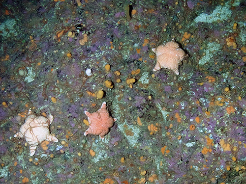 Figure 4. Cushion stars (Hippasteria phrygiana) on bedrocks with encrusting coralline algae (Corallinaceae), Dead-Man's Fingers (Alcyonium digitatum) and brittlestars (Ophiothrix fragilis) (© JNCC & Marine Directorate of the Scottish Government)