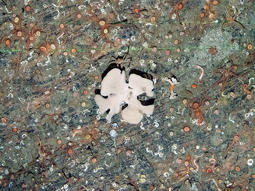 Figure 3. Sponge (Phykellia sp.), Devonshire cup corals (Caryophyllia smithii) and the common brittlestar (Ophiothrix fragilis) (© JNCC & Marine Directorate of the Scottish Government).