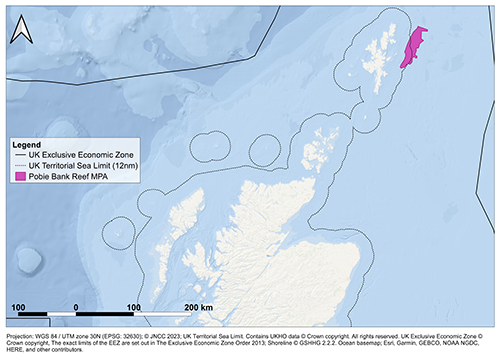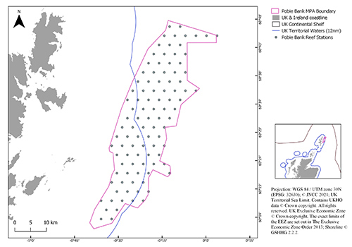 The Pobie Bank Reef SAC is a Marine Protected Area (MPA) located in the Northern North Sea, about 20 km east of Shetland (Figure 1). With a length of approximately 70 km and a width of up to 21 km, the site has an area of 966 km2, similar to the size of the county of Huntingdonshire. Seabed depths in the area range from 70 m to more than 100 m. The site is designated for bedrock and stony reefs that meet the definition of Annex I habitat type 1170 (Reef). As Pobie Bank Reef SAC is located across the 12 nautical mile territorial limit, advice on the site is jointly delivered by JNCC and NatureScot.
