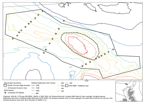 In total, we collected 80 drop frame camera monitoring stations, with the main priority being the stations at the 450m and 800m depth contours, (see Image 1). We also completed a total of 27 CTD stations over three CTD lines across the width of WTR, both inside and outside of the site, (see Image 2).