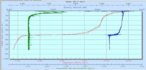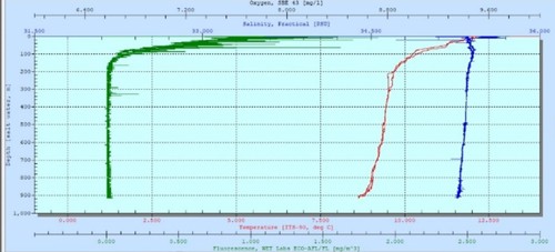 Image 3. Top is a CTD profile from the northern side of WTR showing a sharp change in water temperature (red) and salinity (blue) at ~500 m. Bottom is a CTD profile from the southern side of WTR showing a relatively gradual change in water temperature and salinity when compared with the above. This is preliminary data that has not been fully quality checked.