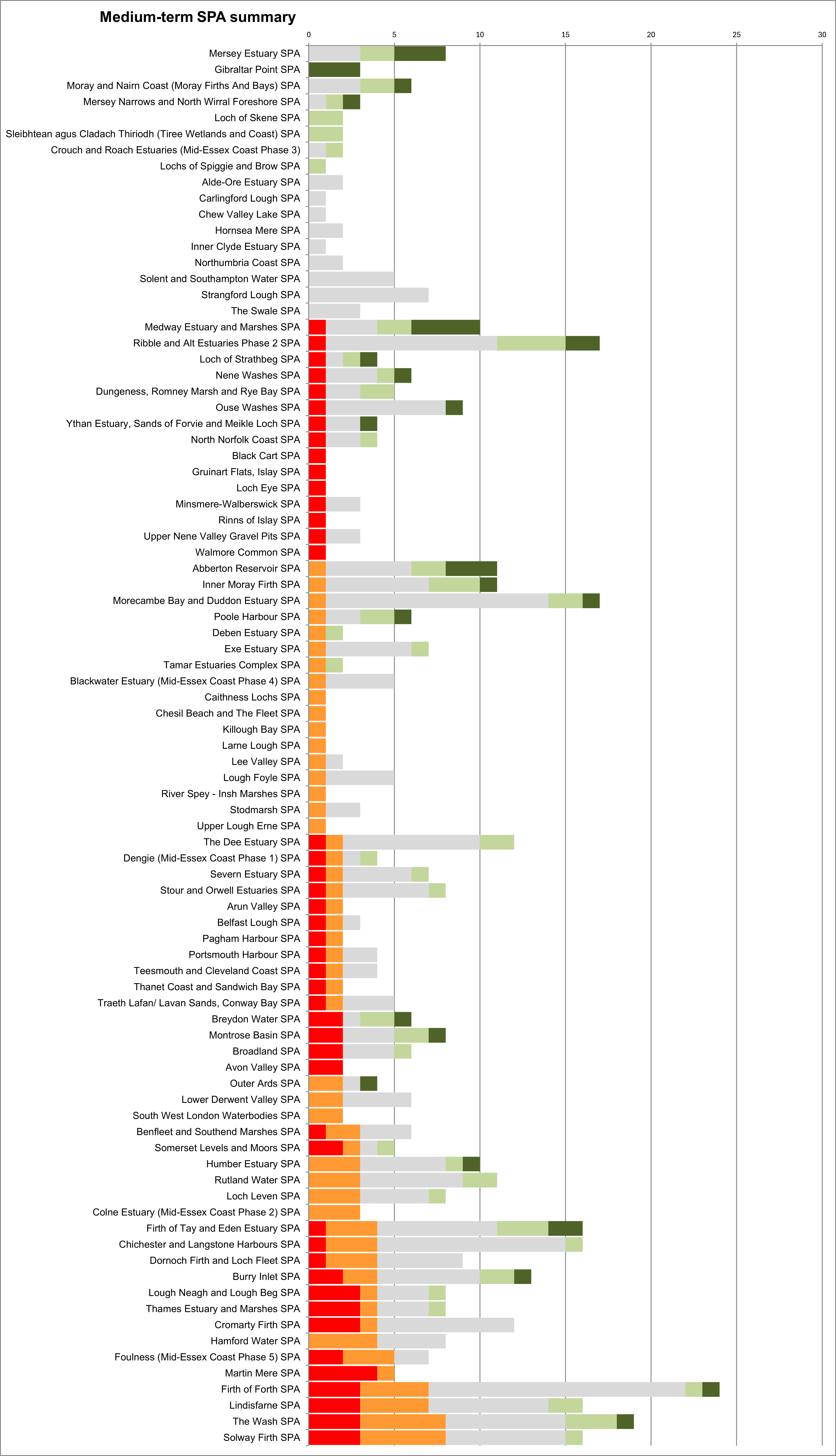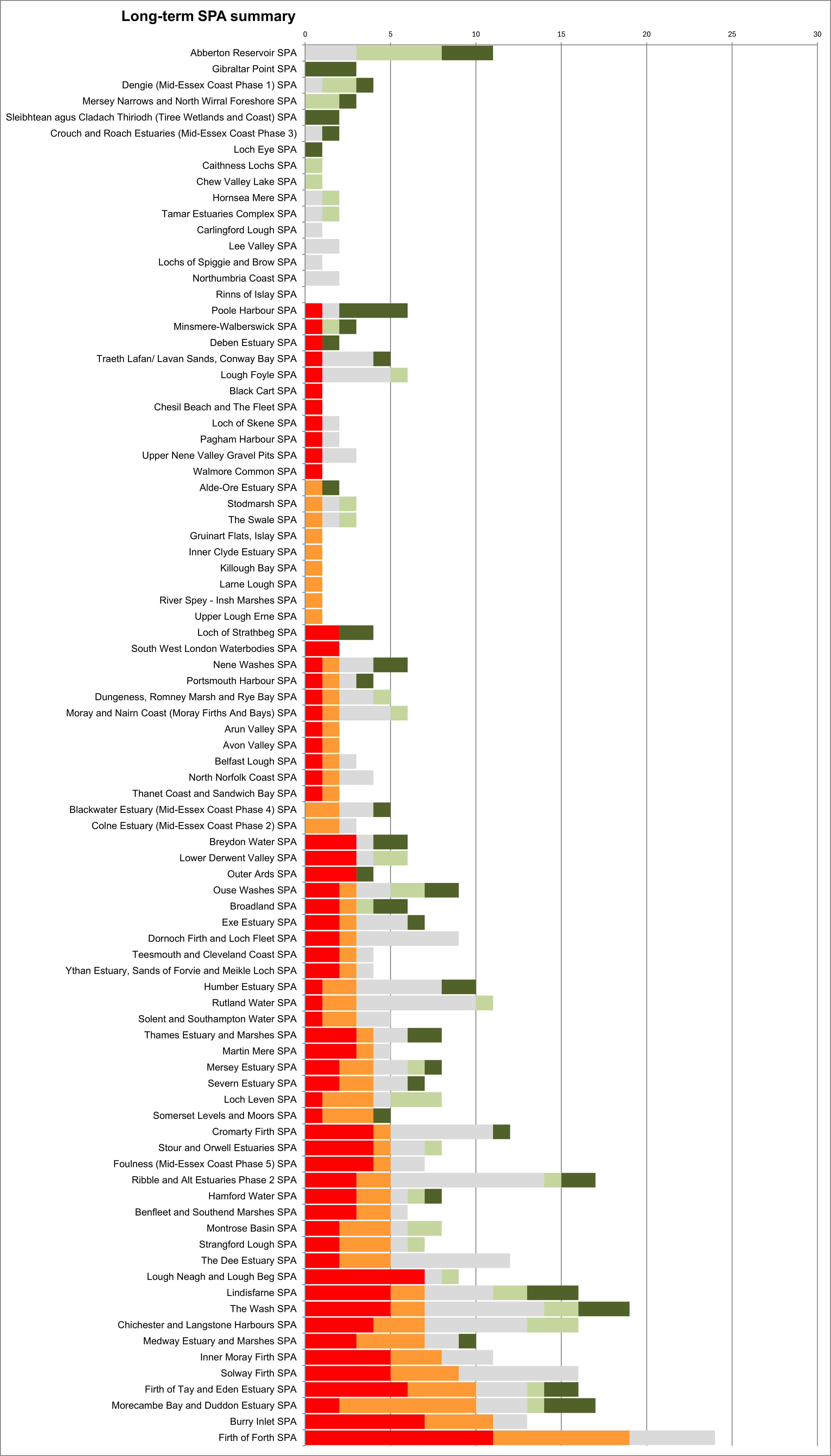 The Alerts are displayed in Figure 1 as stacked histograms which show the Alert status for each of the 87 SPAs assessed during short-, medium- and long-term and since the SPA baseline period. Each bar represents an SPA identified by name and they are sized according to the number of designating waterbird species assessed, which ranges from one to 24. The bars are ordered by the number of Alerts triggered for that SPA, and show the Alerts status for each of the qualifying species in that SPA to help put the Alerts into context.