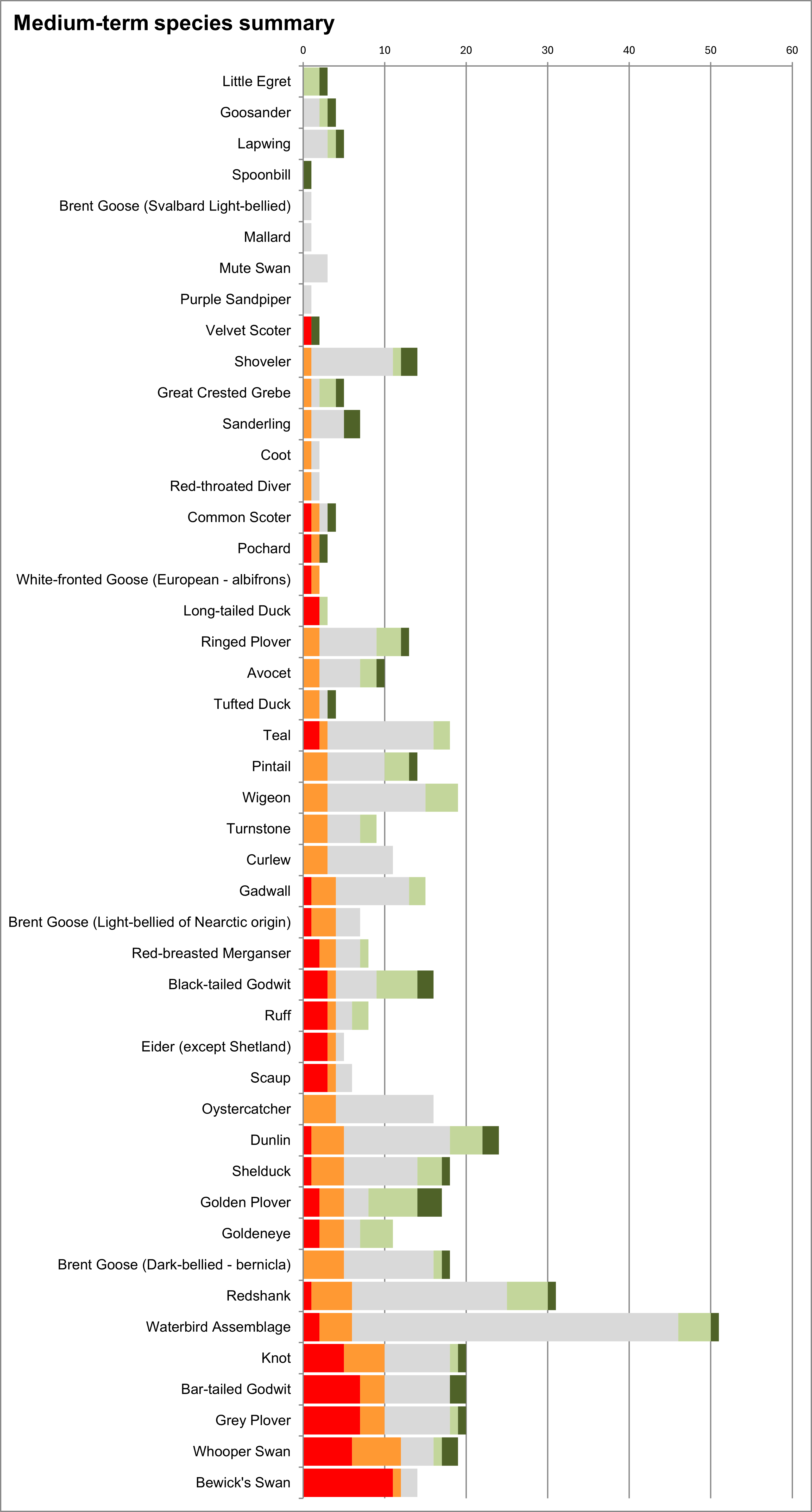 WeBS data from the suite of SPAs in the UK are analysed with the purpose to provide a review of the status of species of waterbirds on each of these sites. Where a species that is a designating feature of an SPA has undergone a major decline in numbers within that SPA, this is flagged by the issuing of an Alert. High (red) Alerts are issued where declines exceed 50%, and Medium (amber) Alerts are issued where declines are 25-50%. Change is assessed over the short term (5yr), medium term (10yr) and long term (25yr), as well as since the baseline data collection that was used for site designation. Trend analysis is also carried out for non-qualifying waterbird features found on sites where appropriate (e.g. where there are sufficient data), but equivalent declines recorded for these species are not officially issued with an ‘Alert status’.