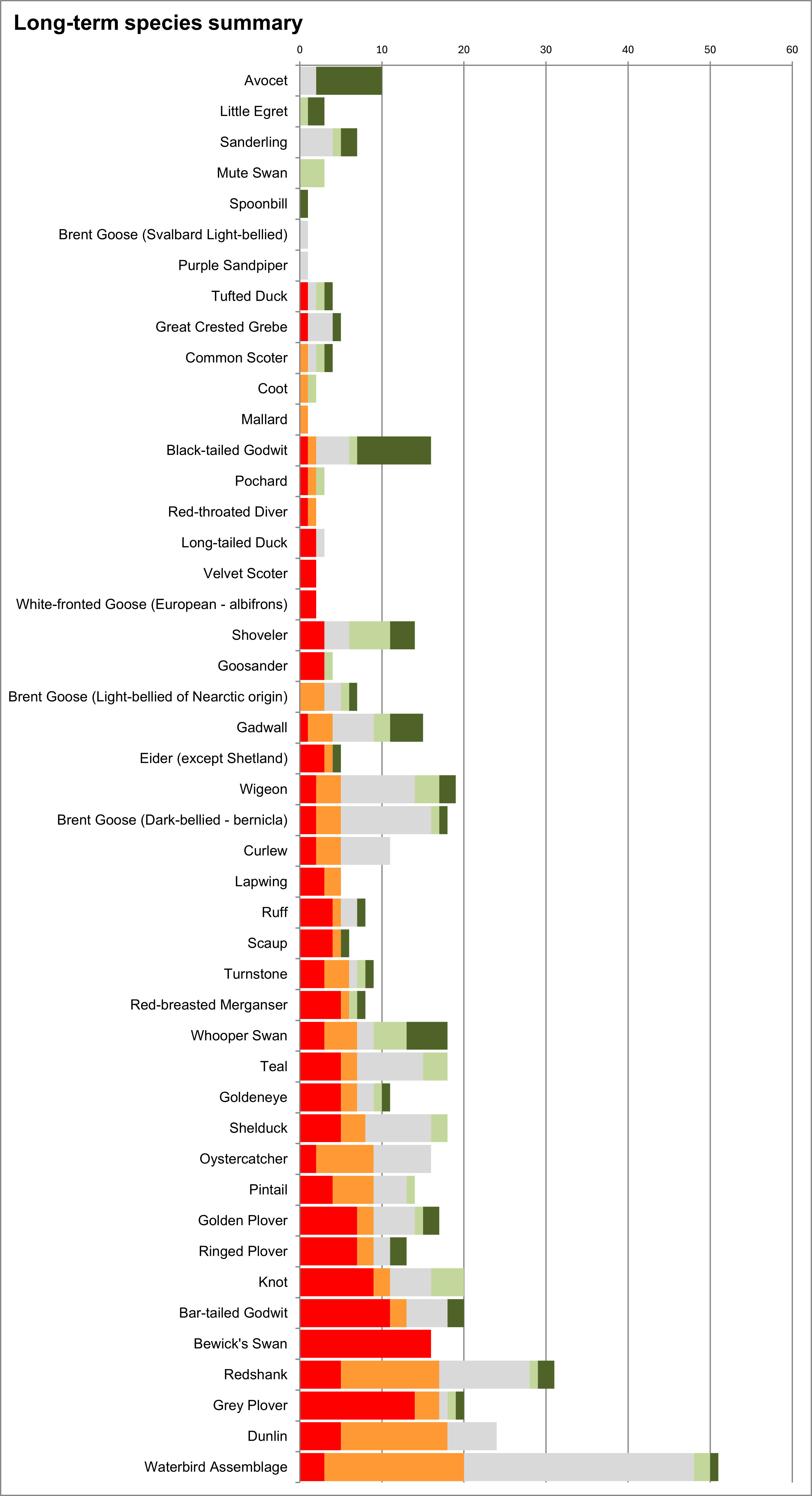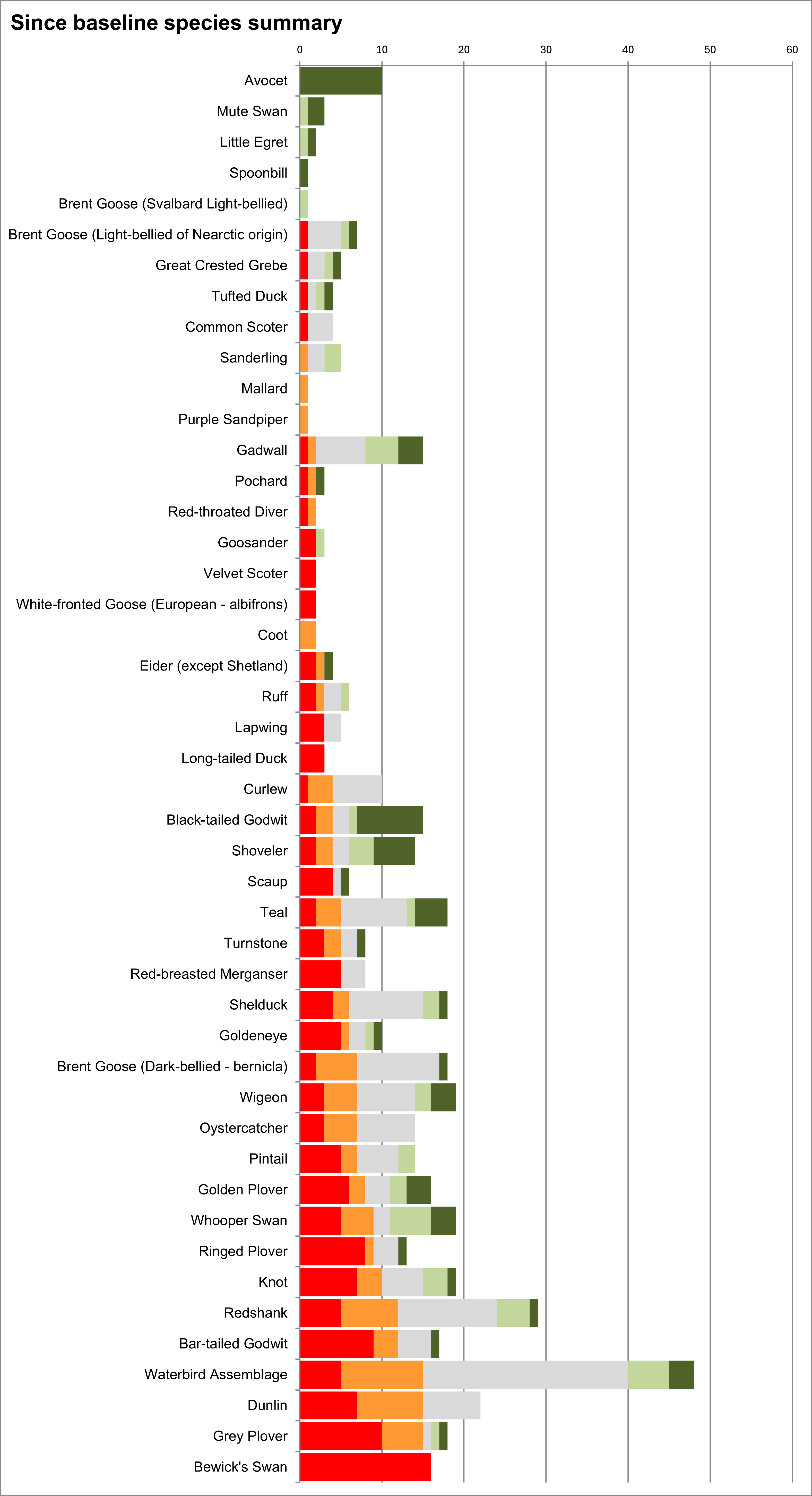 There were around 80 combinations of species and sites where the available data are unsuitable for assessment of trends either due to insufficient numbers or recorded too infrequently for meaningful interpretation using WeBS Alerts methodology. These include all sites for seven of the designating species which are either encountered too infrequently or are too cryptic to monitor reliably.