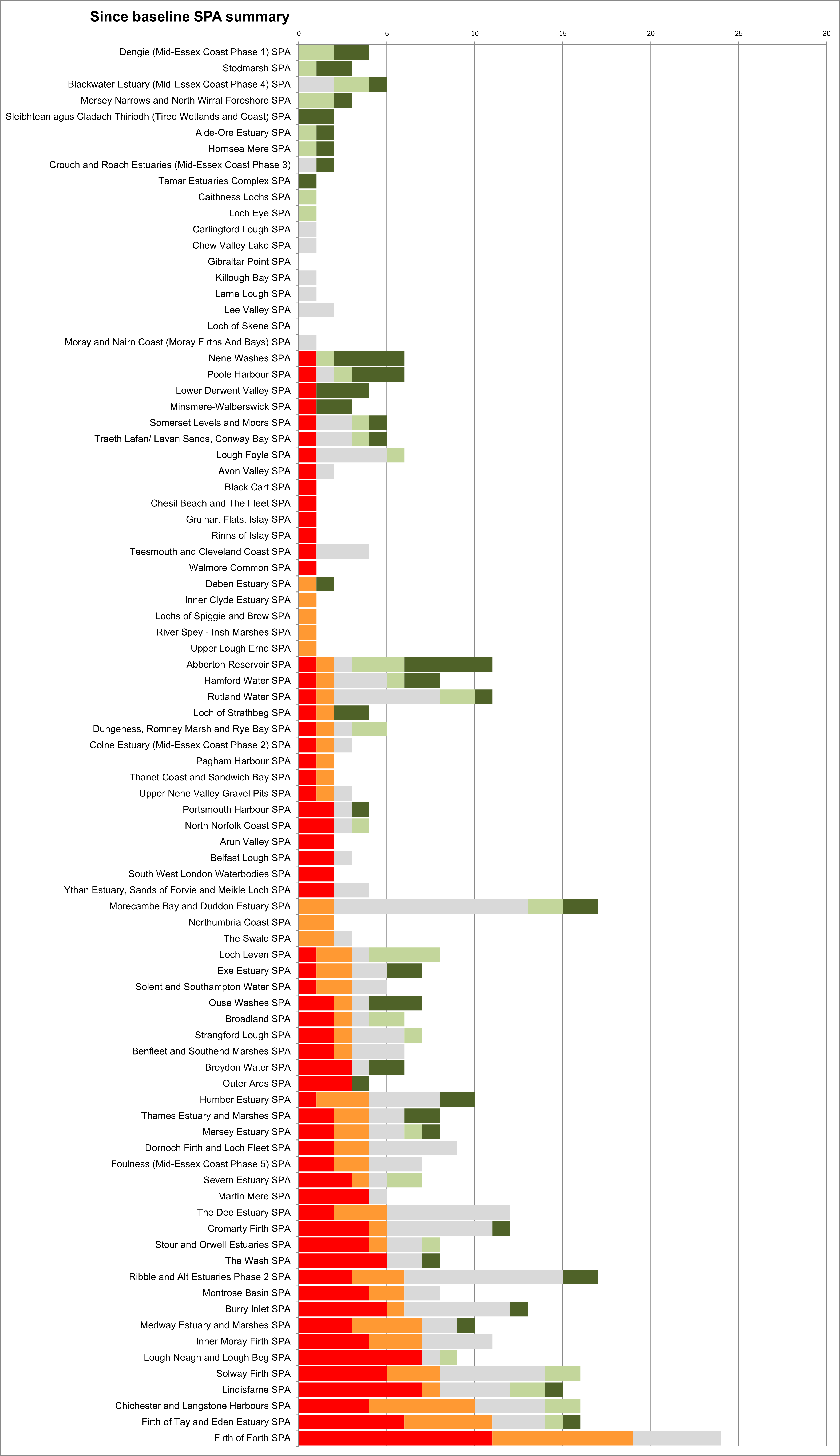 While no Alerts were issued in almost a quarter of the assessments, for five SPAs there were seven occurrences in the long-term and since baseline assessments where ten or more Alerts were triggered (Table 2).